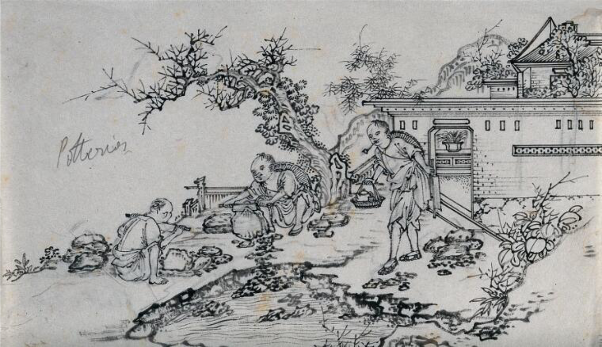 Ceramics are one of the project's four focus areas. This pen and ink drawing shows potters at work in China. Wellcome Library no. 567857i. Public Domain